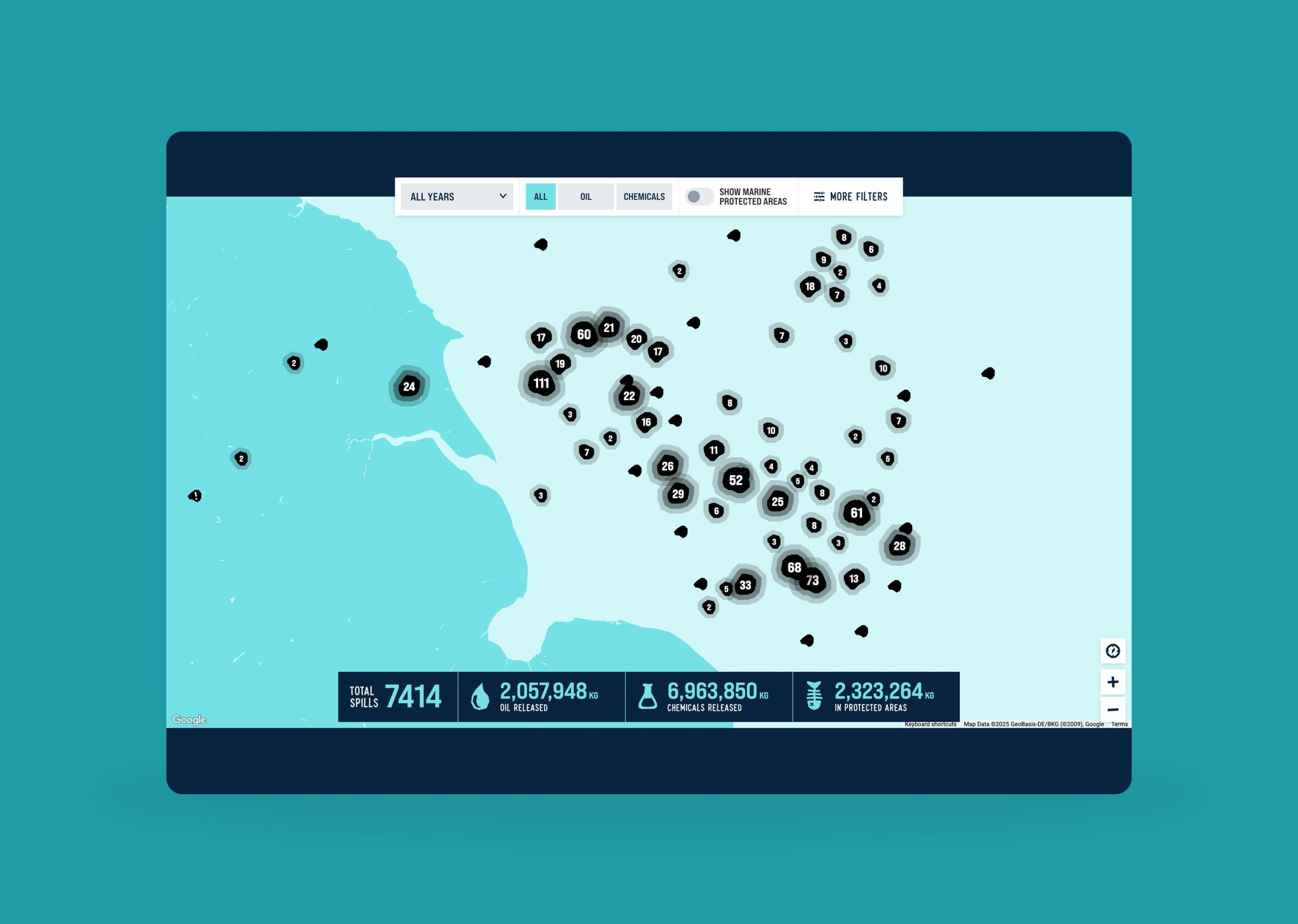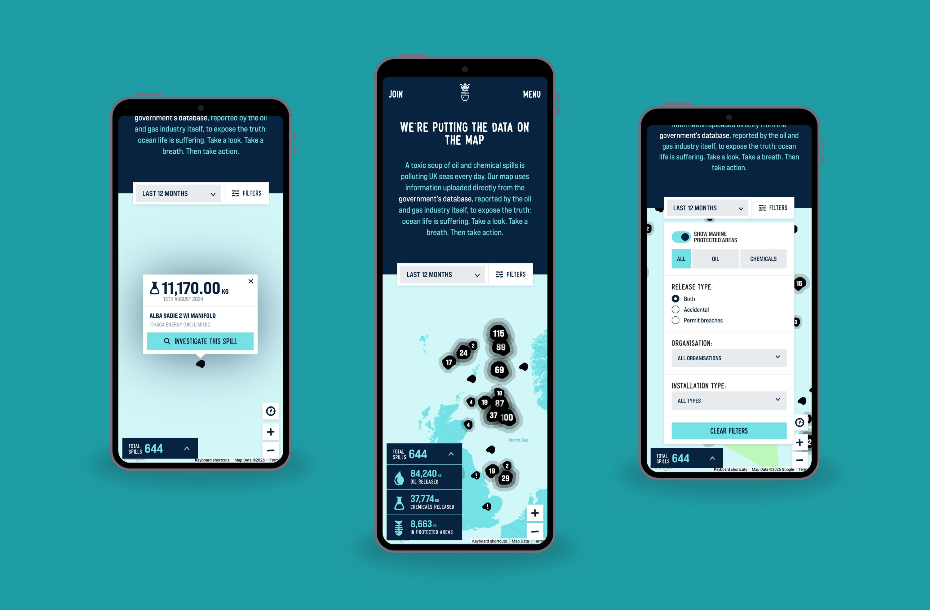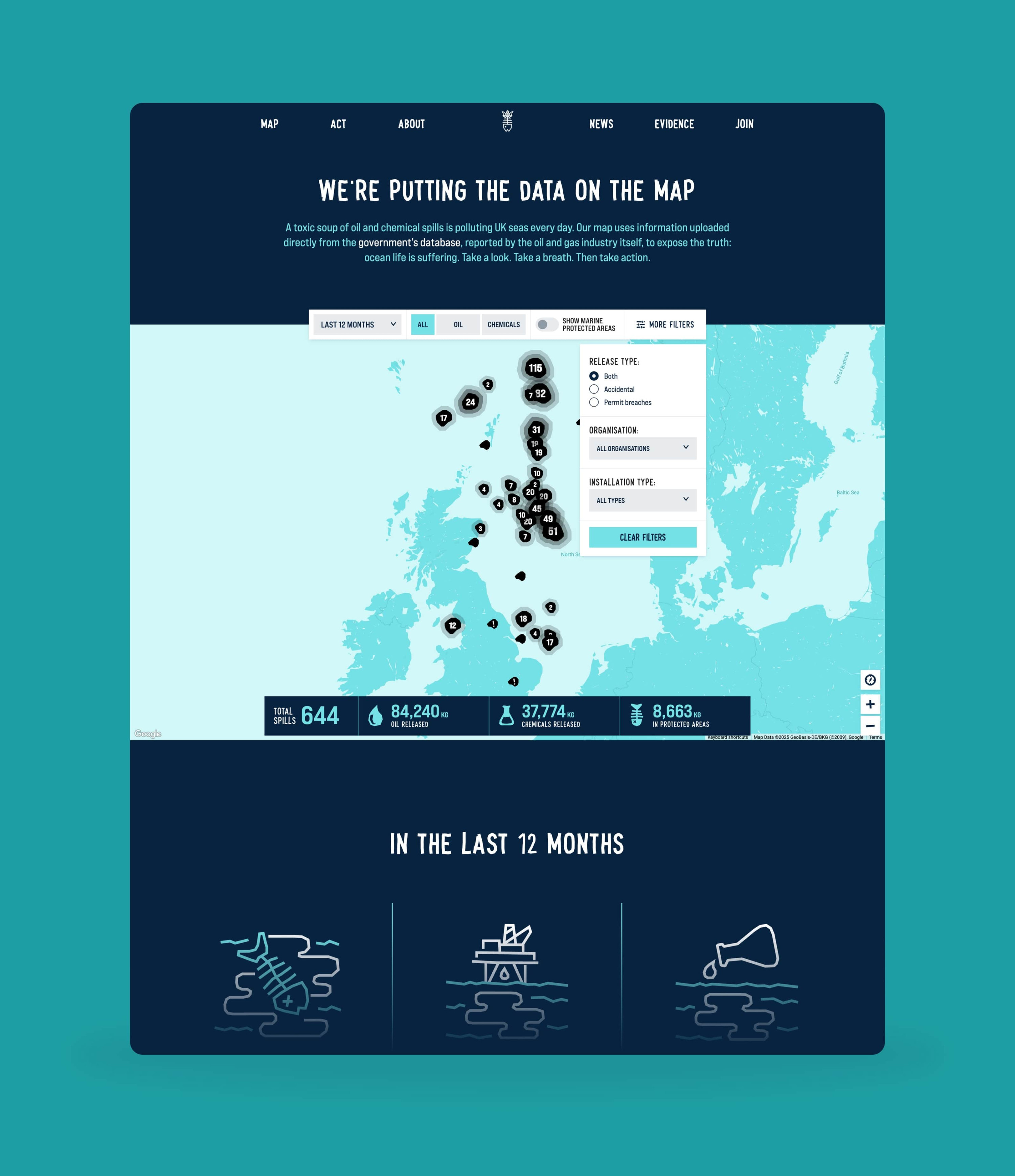 A particularly fun project with Oceana, the largest international advocacy organisations focused solely on ocean conservation. They wanted to raise awareness around oil and chemical spills reported in the seas surrounding the UK. Will Kinchin of Will Works brought me on board, and working with him is always a pleasure.